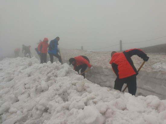 通往主峰的道路蜿蜒崎嶇,路邊的山體嶙峋陡峭,厚達(dá)4—5米的積雪綿延10多公里,陡峭的山體不時(shí)有碎石滾落,面對(duì)如此艱巨的工程,南景區(qū)員工迎難而上,勇往直前,再一次發(fā)揚(yáng)了能吃苦、不怕累、打勝仗的決心和意志。員工們起早貪黑、櫛風(fēng)沐雨,短短一周的時(shí)間里,10多公里的積雪在清雪車的轟鳴中被一層層的剝離清理。5月11日,通往主峰天池停車場(chǎng)的道路全線貫通。
