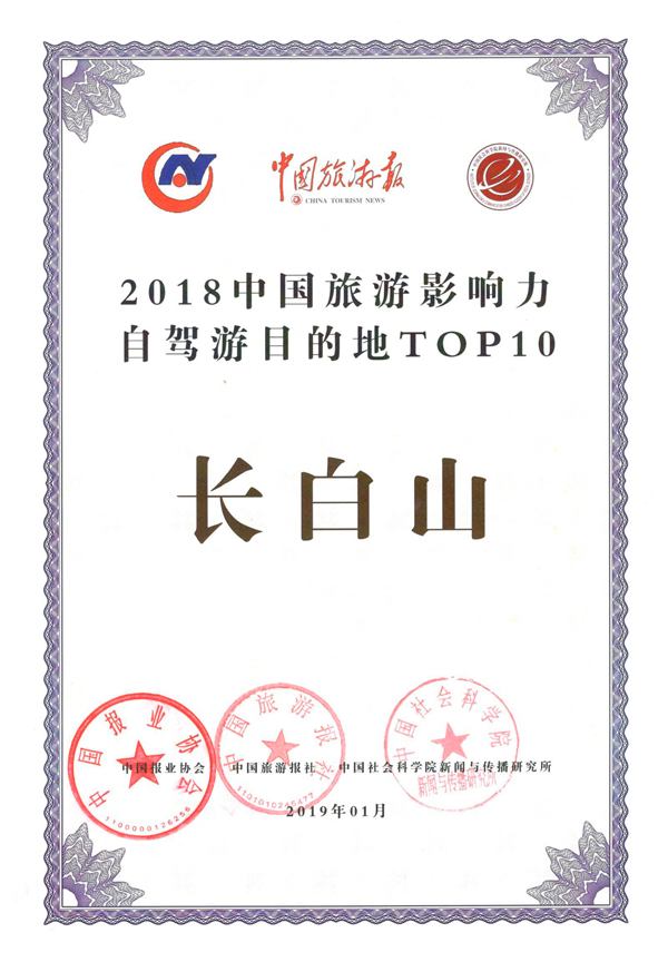 經(jīng)文化和旅游部批準,由中國報業(yè)協(xié)會指導、中國旅游報社主辦、中國社會科學院新聞與傳播研究所學術支持的“2019中國旅游產(chǎn)業(yè)年會”于2019年1月23日在北京亮馬河會議中心舉行,長白山被授予2018中國旅游影響力自駕游目的地TOP10。