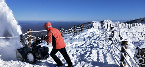 他們是寒冬里的一抹橘,時(shí)刻溫暖著游客的心。中午12時(shí)40分,天池迎來(lái)了當(dāng)天的第一批游客,吳經(jīng)理立即抽調(diào)了幾名員工去為游客提供安全和相關(guān)的暖心服務(wù)工作。游客們興高采烈地觀賞著雪后天池的壯美景觀,不斷贊嘆著大自然的鬼斧神工。游客們開(kāi)心滿意的笑容,讓主峰管理部的員工們倍感自豪,經(jīng)過(guò)大家的不懈努力,游覽棧道的拓寬工作,已于當(dāng)日15時(shí)圓滿結(jié)束。