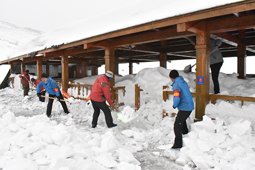 長(zhǎng)白山冬季漫長(zhǎng),雪量極大,西景區(qū)各候車回廊經(jīng)過一冬天風(fēng)雪“洗禮”,積雪已超過一人多高。為迎接“五一”小長(zhǎng)假,確保旅游安全有序,景區(qū)運(yùn)營(yíng)三部抽調(diào)經(jīng)理級(jí)管理人員、調(diào)度員、駕駛員共計(jì)20余人,組建清雪專班。專班人員分工協(xié)作,一組負(fù)責(zé)拴好安全繩推落棚頂積雪,另一組一鍬鍬鏟除積雪,汗珠常常掛滿額頭,濕透棉衣。隊(duì)員們起早貪黑、加足干勁、就地進(jìn)餐,他們既承擔(dān)起高強(qiáng)度作業(yè),又承受著積雪反射紫外線對(duì)皮膚造成的傷害,經(jīng)過一周“浴雪奮戰(zhàn)”,王池、峽谷、換乘和主峰等景點(diǎn)候車回廊積雪已全部清理完畢。